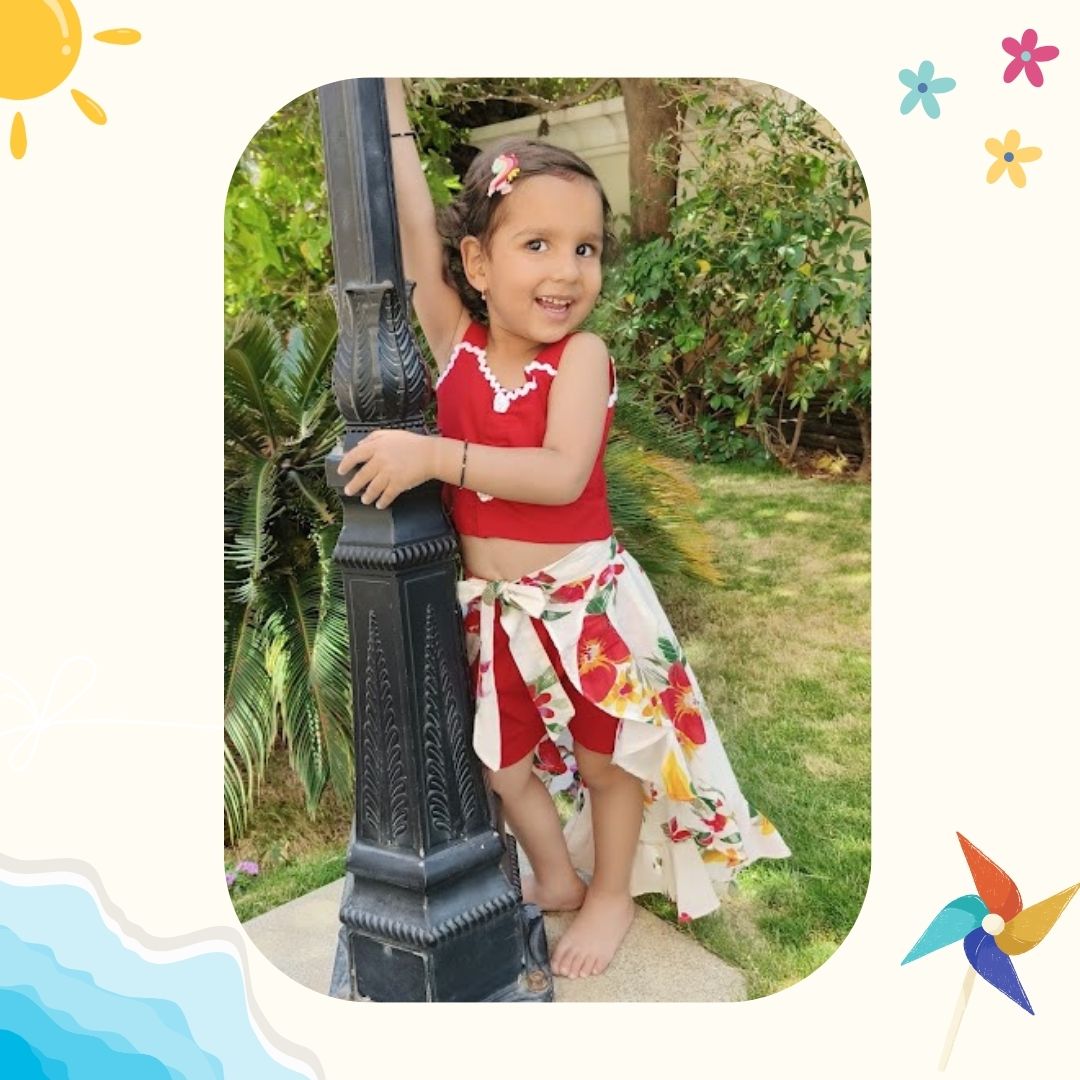 Unleash endless summer fun with our 3-piece co-ord set! 💃 Our sleeveless top and shorts, made from stretchy material, ensure flexibility for beach play. Paired with a cotton floral wrap skirt in vibrant red and white, it's perfect for beach days - easily remove the skirt for water play! Cool and breezy with its sleeveless design, it's the ultimate summer ensemble. Let the adventures begin!