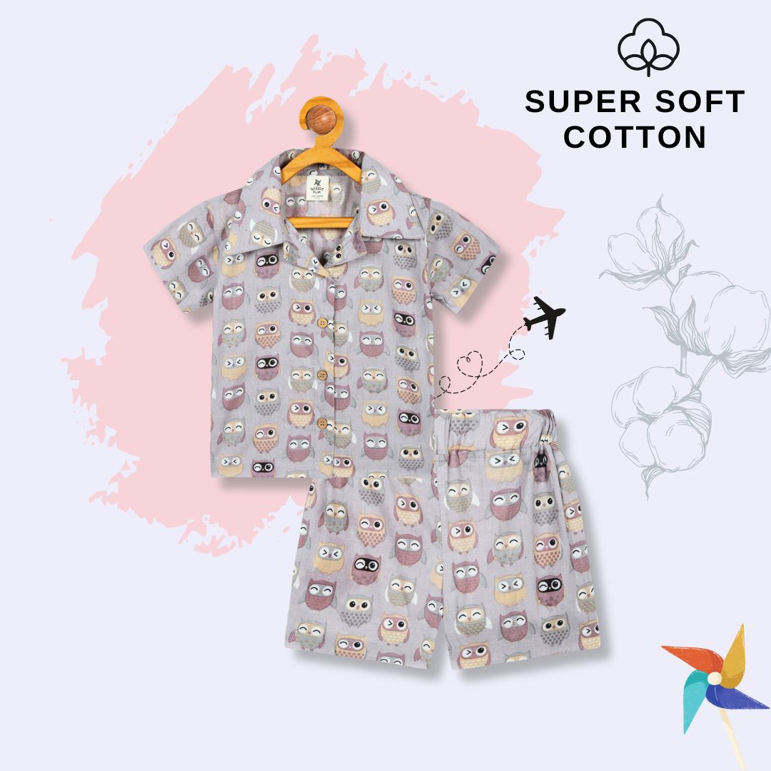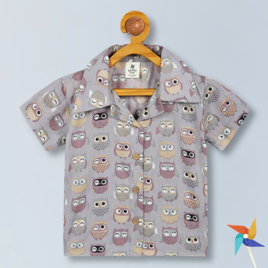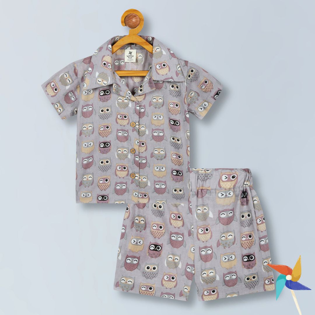 100% Cotton extremely comfortable co-ord set Shirt and Shorts - Boys Grey Owl Print