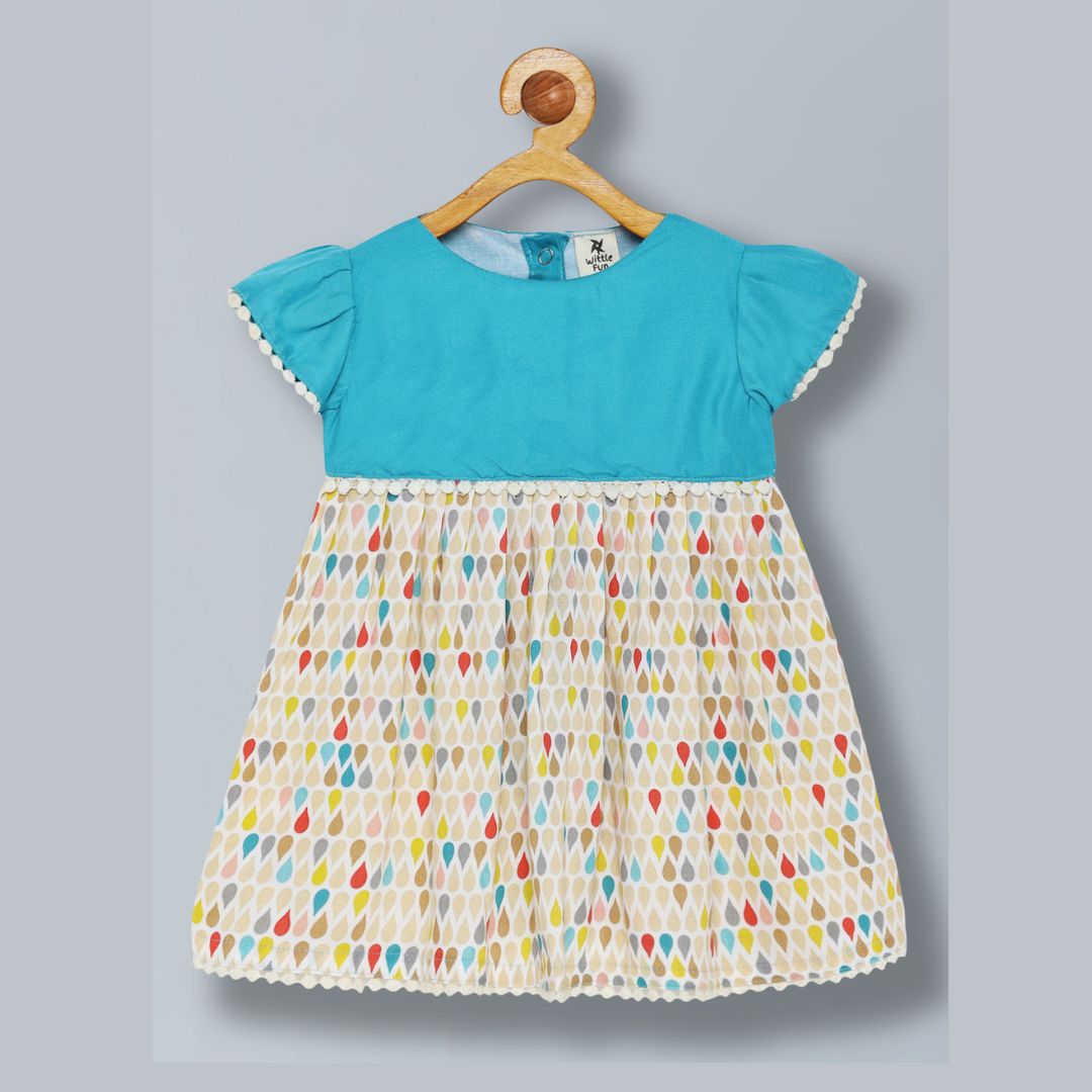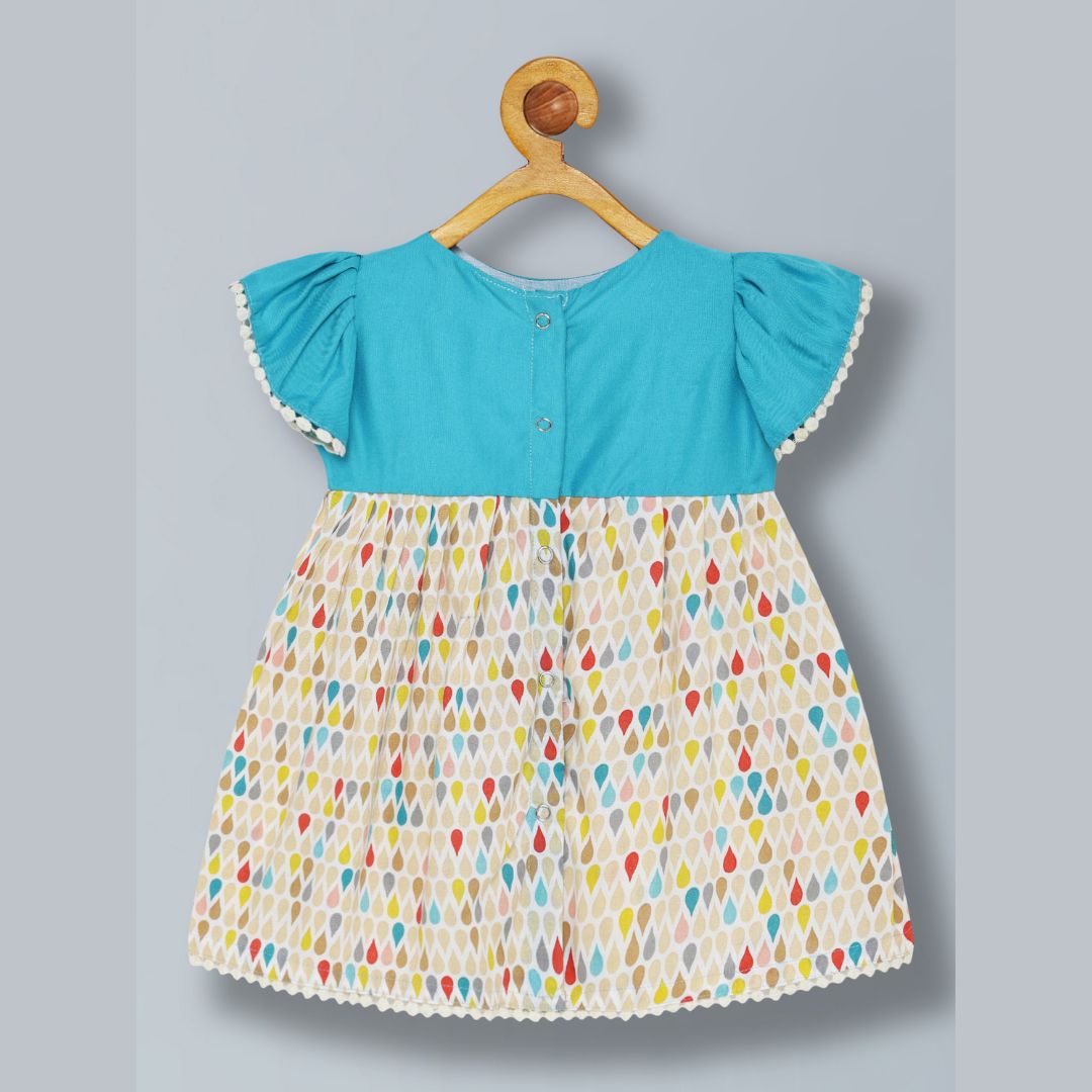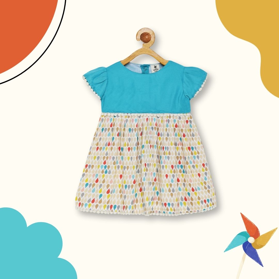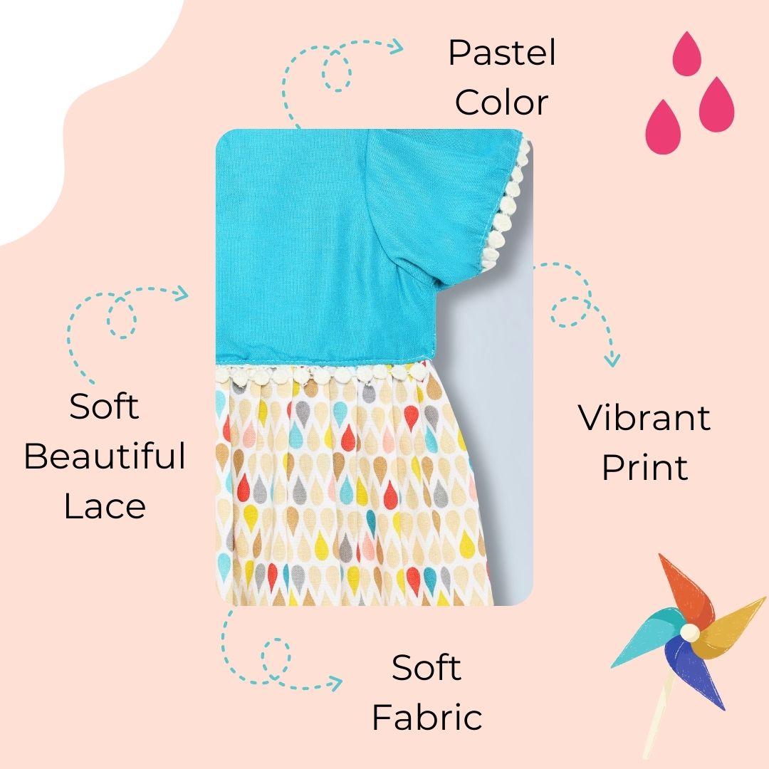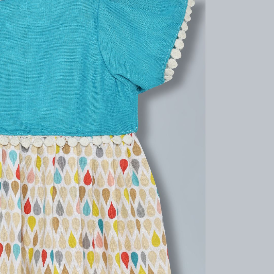 100% cotton jhabla frock with soft lace and playful drop print- blue & multicolor
