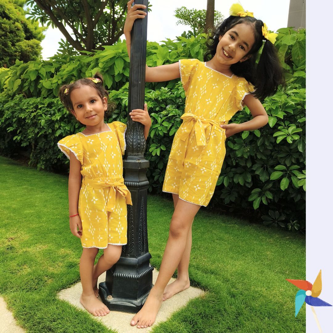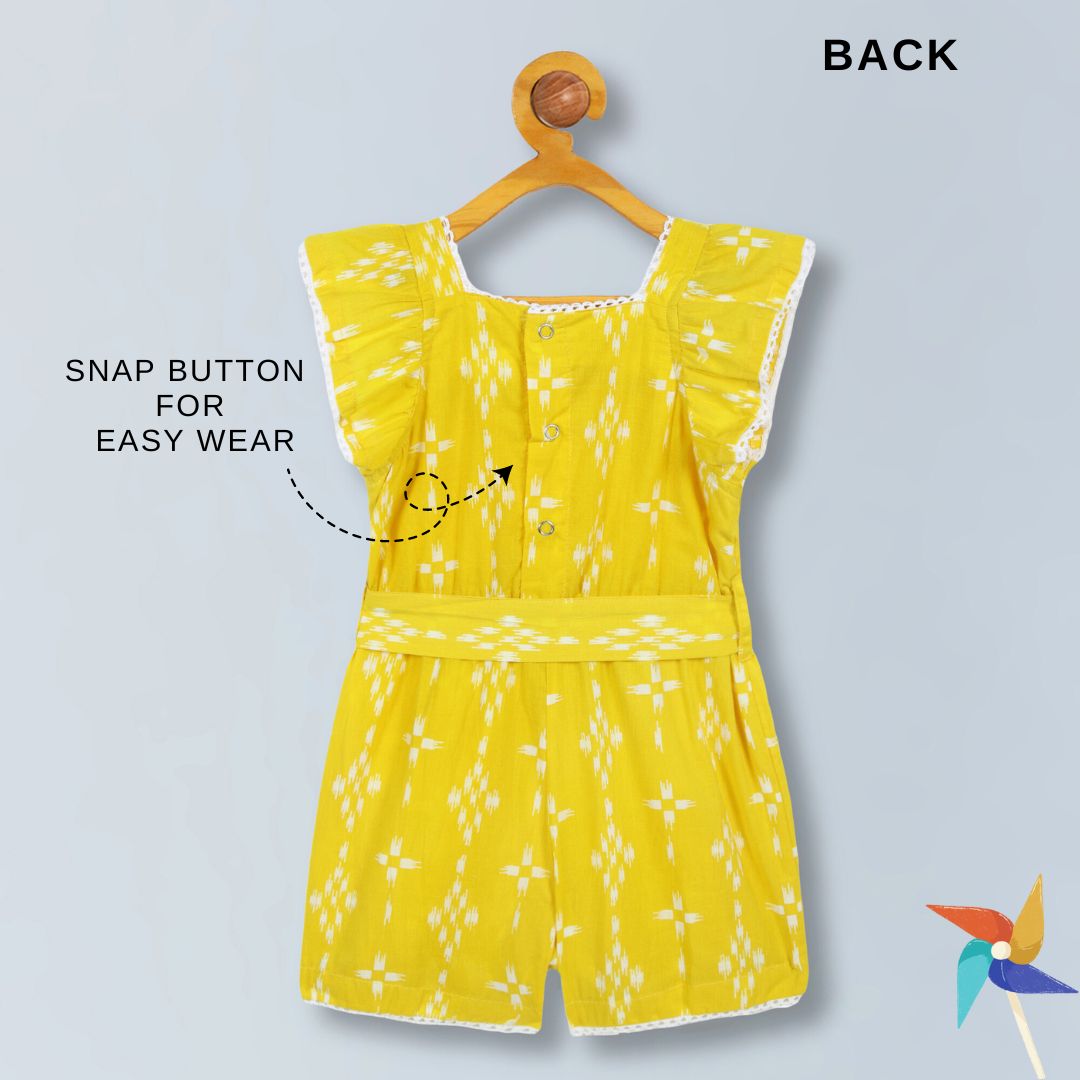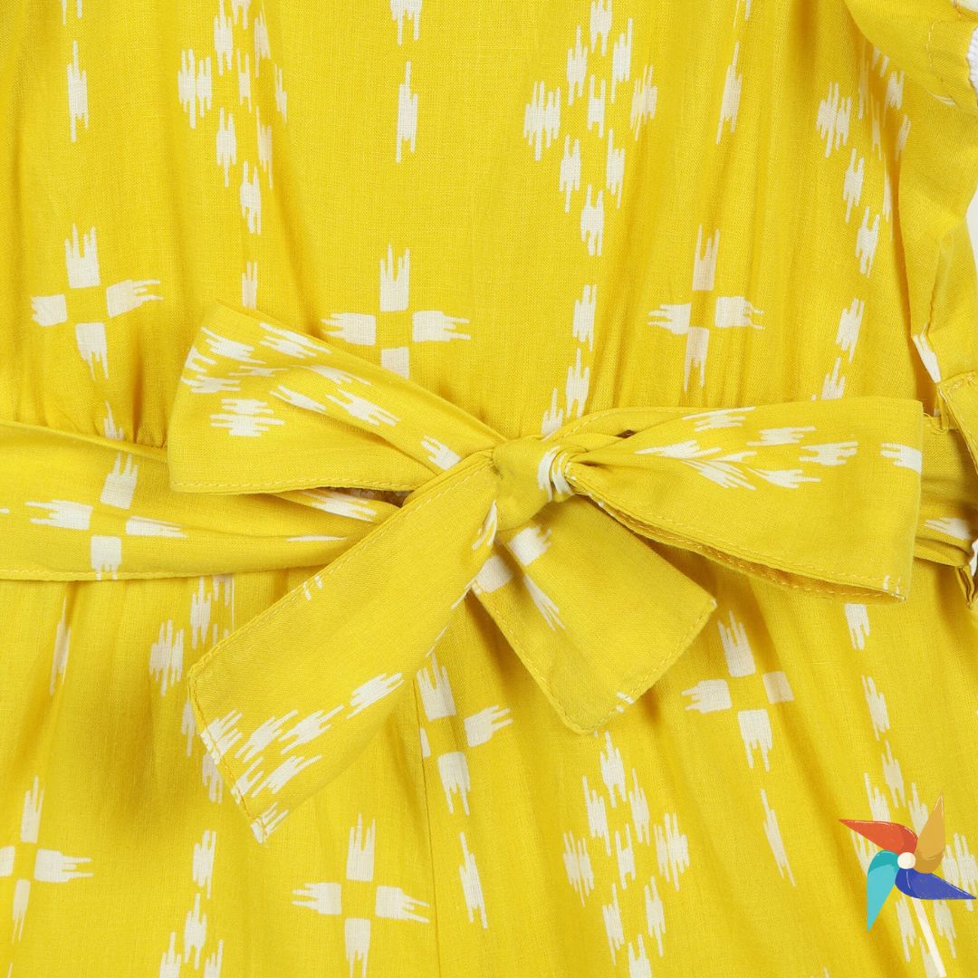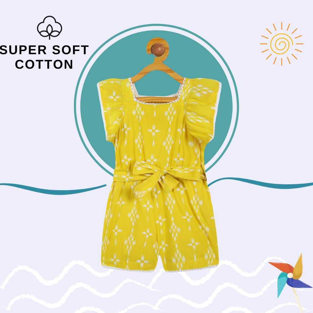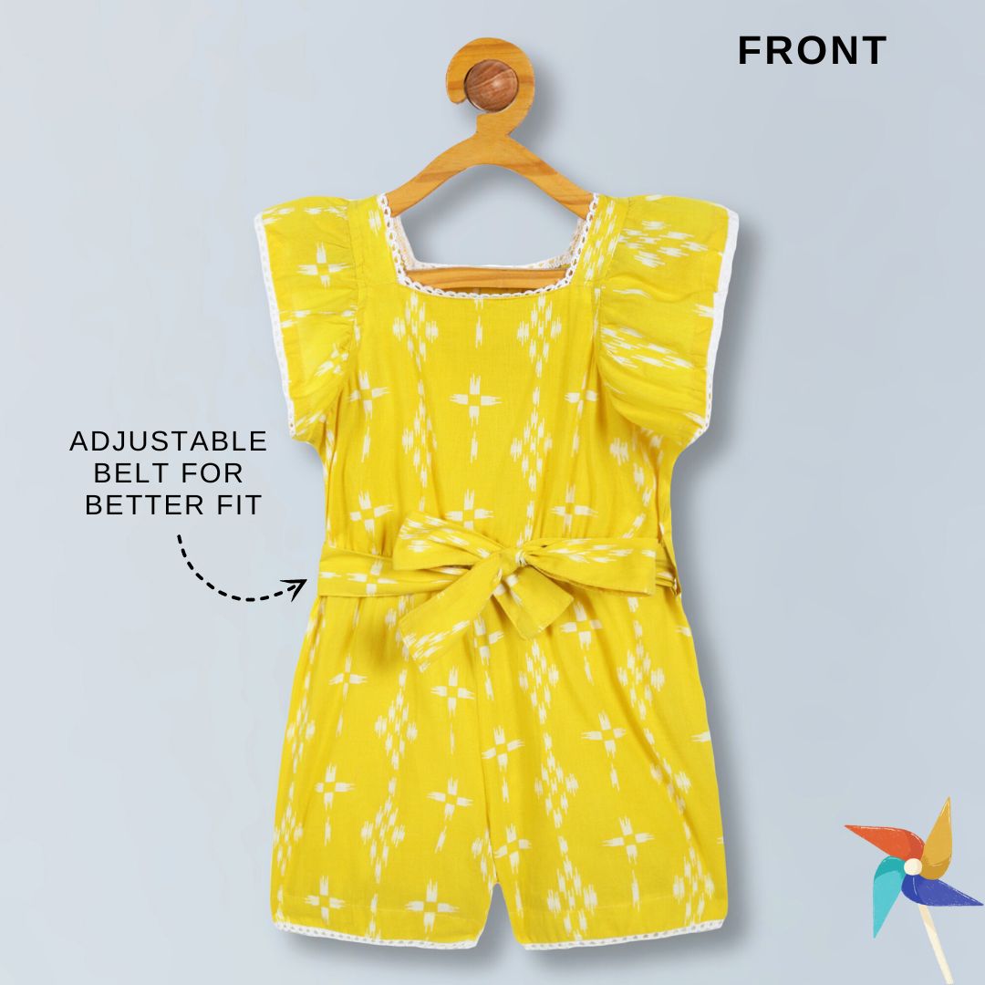 Got a girl who wants to look her best all day long? This yellow jumpsuit, made of 100% breathable cotton, is the perfect pick! With flared sleeves and adjustable belt for a flexible fit, it's the ultimate quirky and fun outfit for your playful little fashionista.