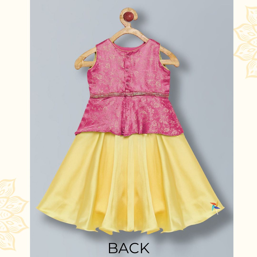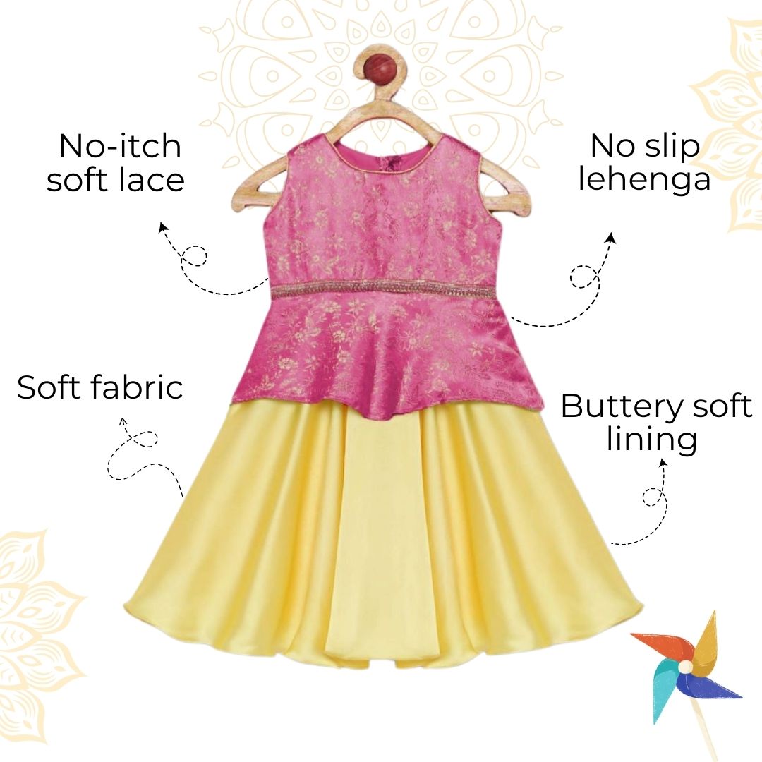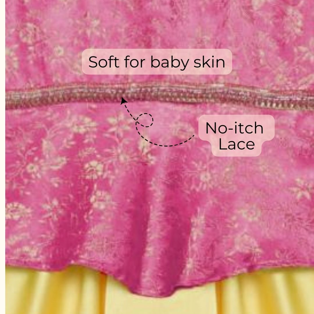 No more slipping and sliding from waist for your little diva with our 'No Slip Lehenga'! Made with silky satin material, buttery soft lining and soft lace to prevent itching, this satin lehenga is suitable for babies up to 1 year. Your little one will look adorable in this green and yellow outfit. (Please note: choli is attached to lehenga.)