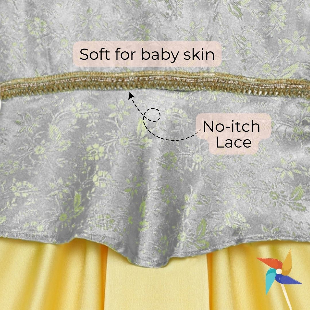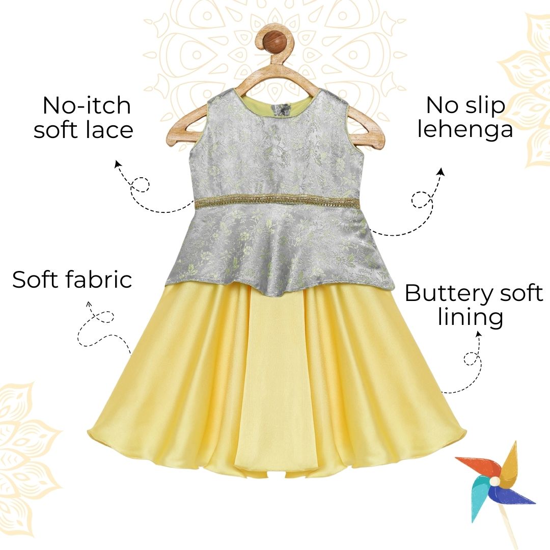 No more slipping and sliding from waist for your little diva with our 'No Slip Lehenga'! Made with silky satin material, buttery soft lining and soft lace to prevent itching, this satin lehenga is suitable for babies up to 1 year. Your little one will look adorable in this green and yellow outfit. (Please note: choli is attached to lehenga.)