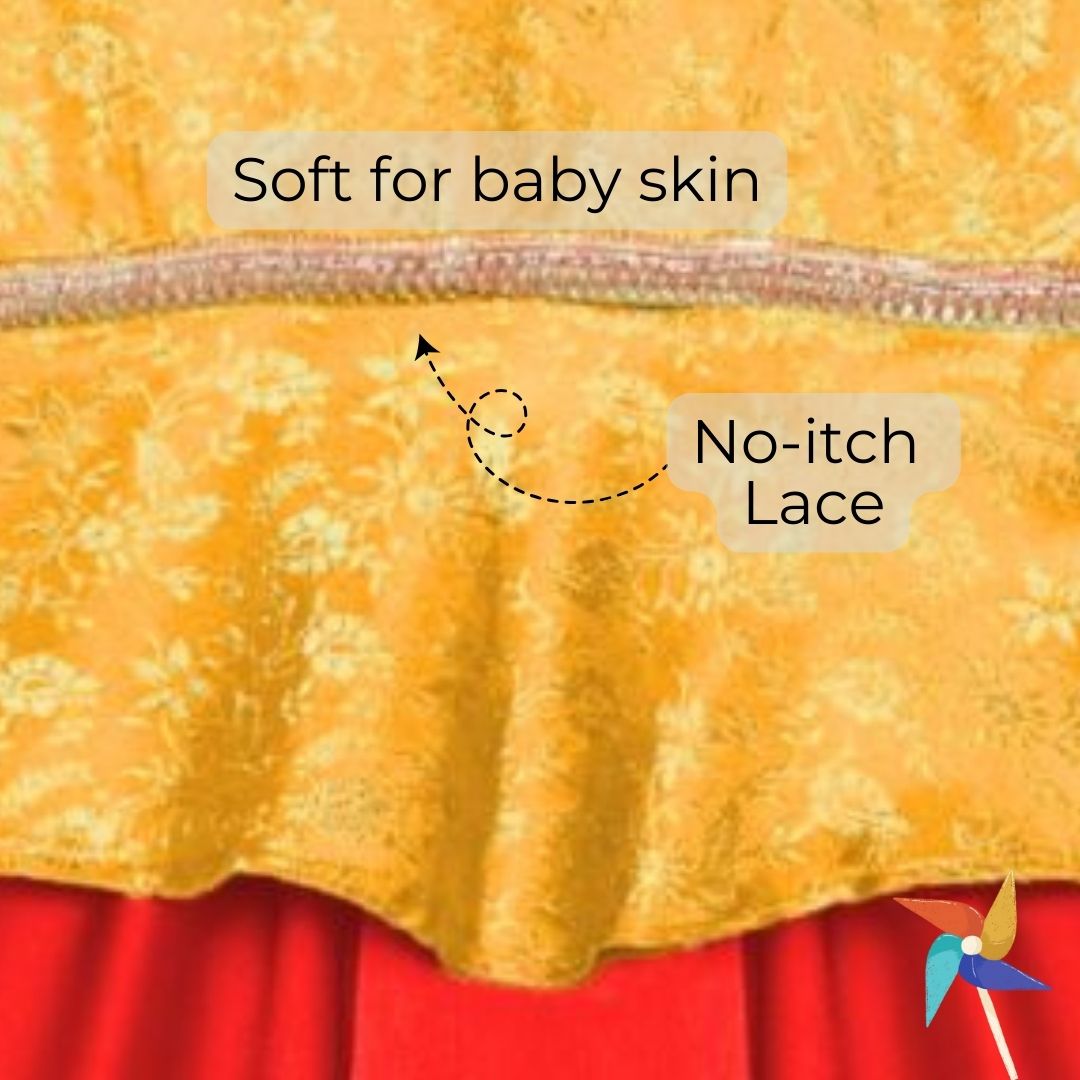No more slipping and sliding from waist for your little diva with our 'No Slip Lehenga'! Made with silky satin material, buttery soft lining and soft lace to prevent itching, this satin lehenga is suitable for babies up to 1 year. Your little one will look adorable in this green and yellow outfit. (Please note: choli is attached to lehenga.)